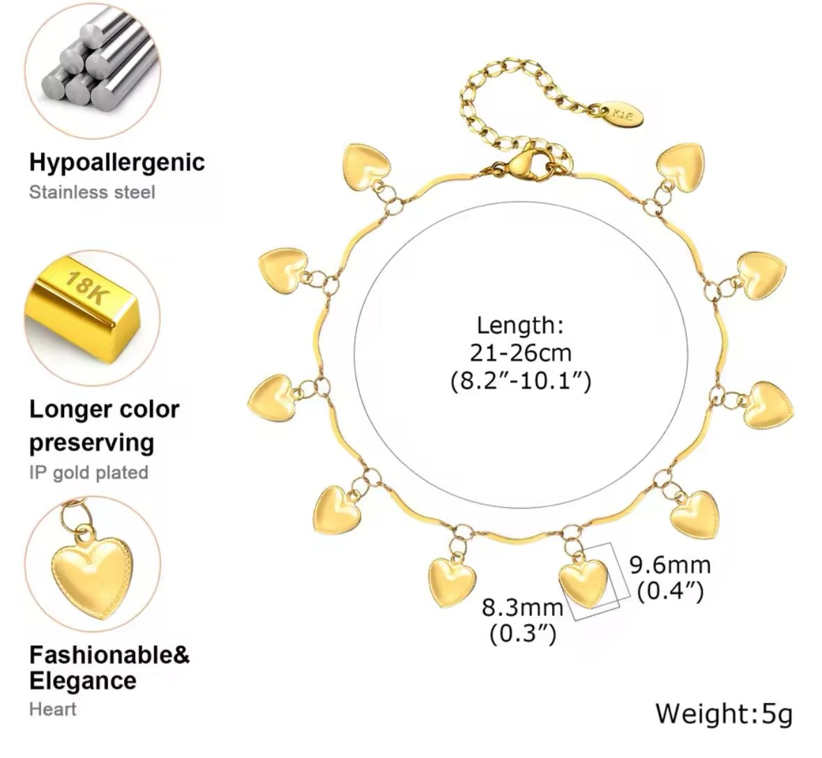 PVD 18K Gold Plated Over Stainless Steel Gold tone Waterproof & sweat proof + Anti Tarnish. Hypoallergenic safe for all kind of skin Luxurious Premium Quality For The Price! Can be Worn everyday as the material is durable and long lasting. A Perfect Gift