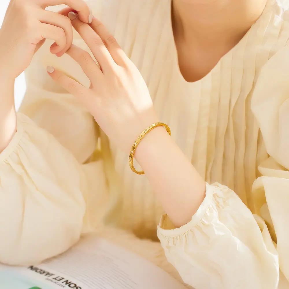 This Regina Bracelet features a PVD 18K Gold Plating Over Stainless Steel with a gold tone and 4A Micro Cz Stones. It is waterproof, sweatproof, anti-tarnish, and hypoallergenic, safe for all skin types. The durable and long-lasting material ensures it can be worn every day, making it an ideal gift.