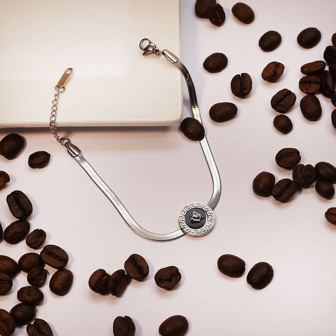 Channel iconic Versace style with this stunning inspired medallion bracelet. Featuring a bold silver medallion pendant on a sleek this bracelet exudes a luxurious and glamorous vibe. Perfect for adding a touch of designer-inspired flair to any outfit.